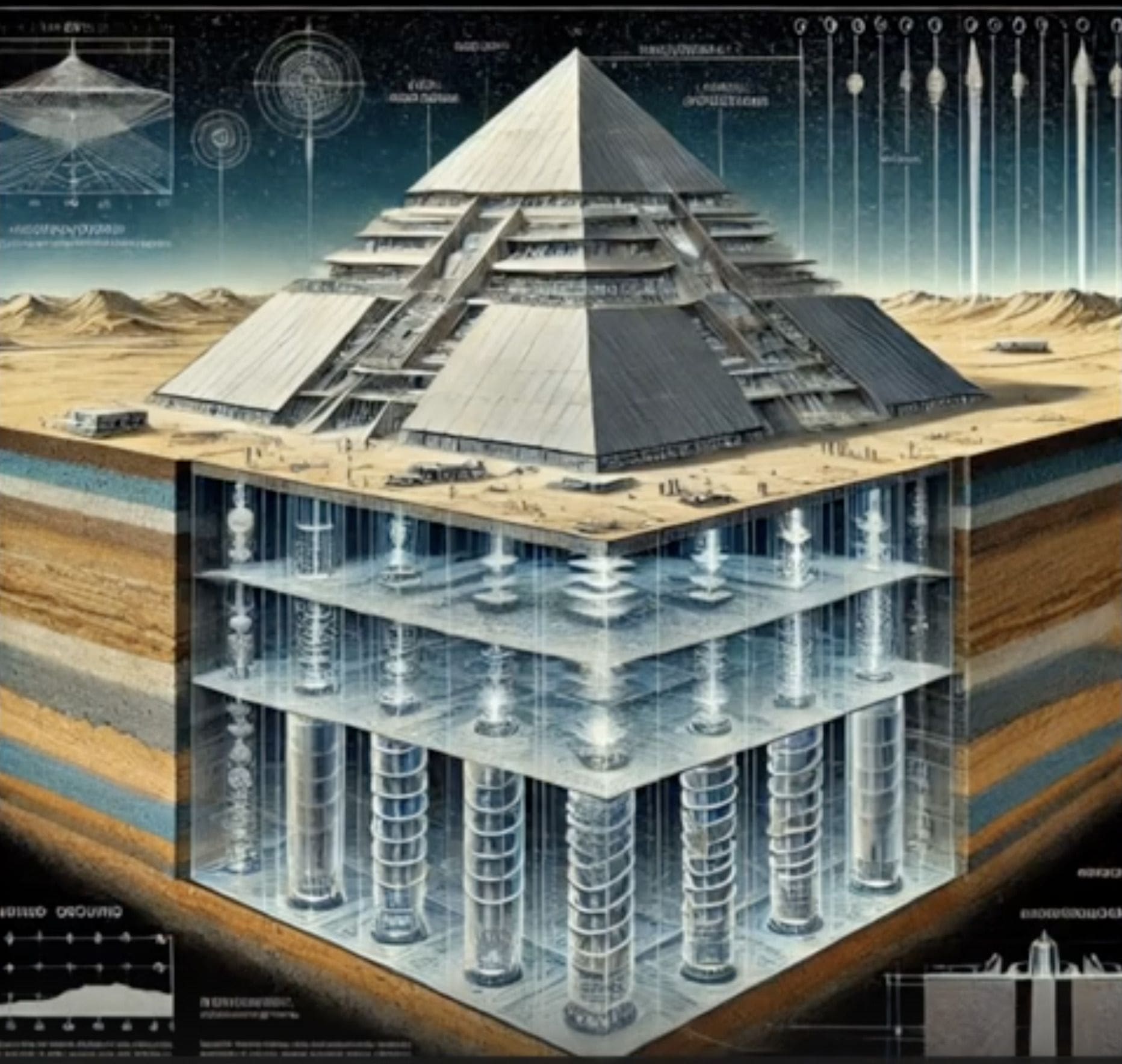 Resonant voids deep underground could stimulate mechanical stress in the rock, creating surface-coupled oscillations through the piezoelectric effect.The pyramids’ precise geometry could enhance wave reflection and standing wave formation, essentially acting as a mechanical amplifier for deep resonance.