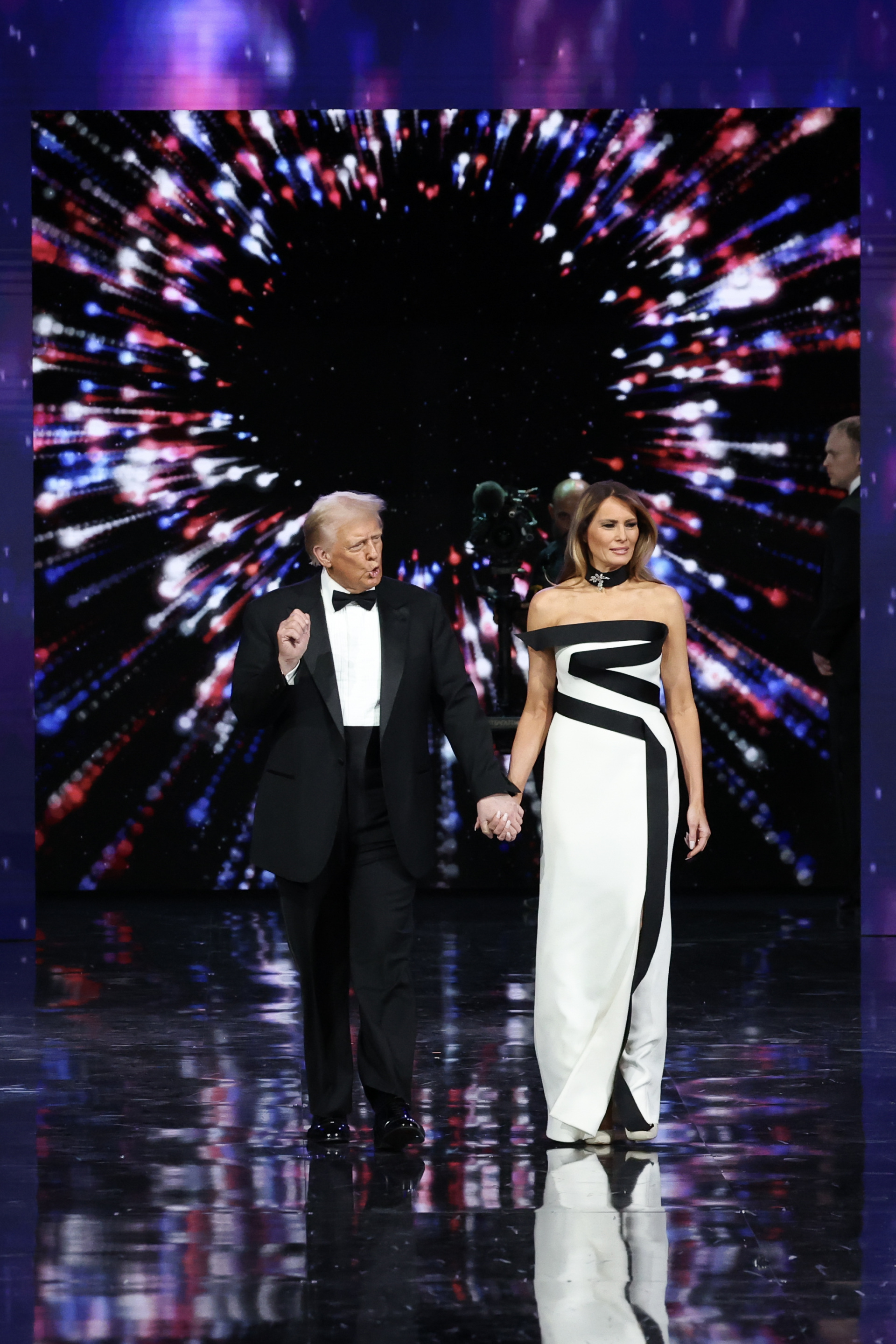 WASHINGTON, DC – JANUARY 20: President Donald Trump walks onstage with wife Melania at the Commander-in-Chief Ball on January 20, 2025 in Washington, DC. President Trump attends some of the inaugural balls after taking the oath as the 47th president. (Photo by Anna Moneymaker/Getty Images)