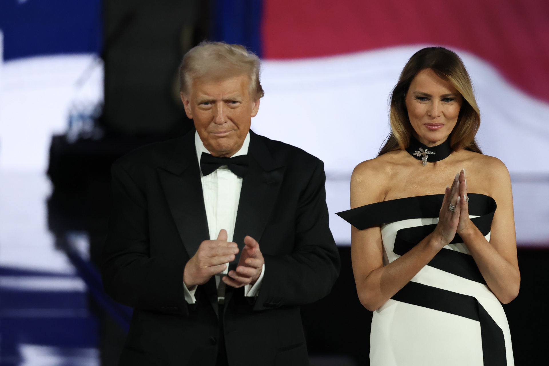 WASHINGTON, DC – JANUARY 20: President Donald Trump on stage with his wife First Lady Melania Trump at the Liberty Inaugural Ball on January 20, 2025 in Washington, DC. President DonaldTrump attends some of the inaugural balls after taking the oath as the 47th president. (Photo by Joe Raedle/Getty Images)