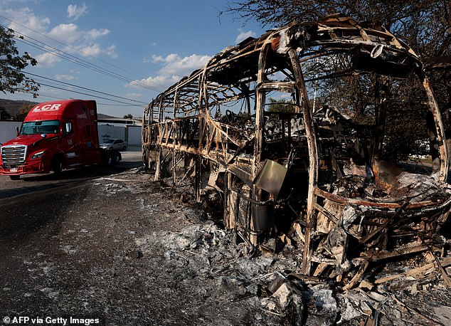 Fiery chaos has erupted throughout the Mexican state of Jalisco, leaving some tourists stranded. A bus set on fire by cartel members in the state is pictured
