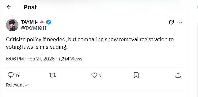 However, some argued that the two policies differ and cannot be compared, with one writing: 'Criticize policy if needed, but comparing snow removal registration to voting laws is misleading.'