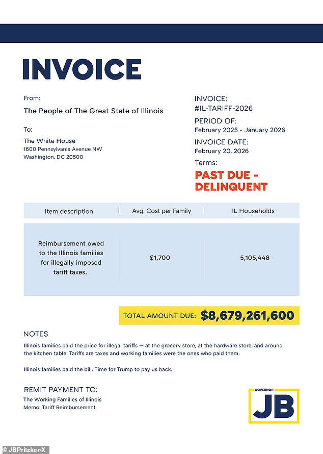 Pritzker wrote a letter to Trump demanding he issue refunds to the people of Illinois now that the court has ruled the trade policies unconstitutional, attached with an invoice for $8.6billion.
