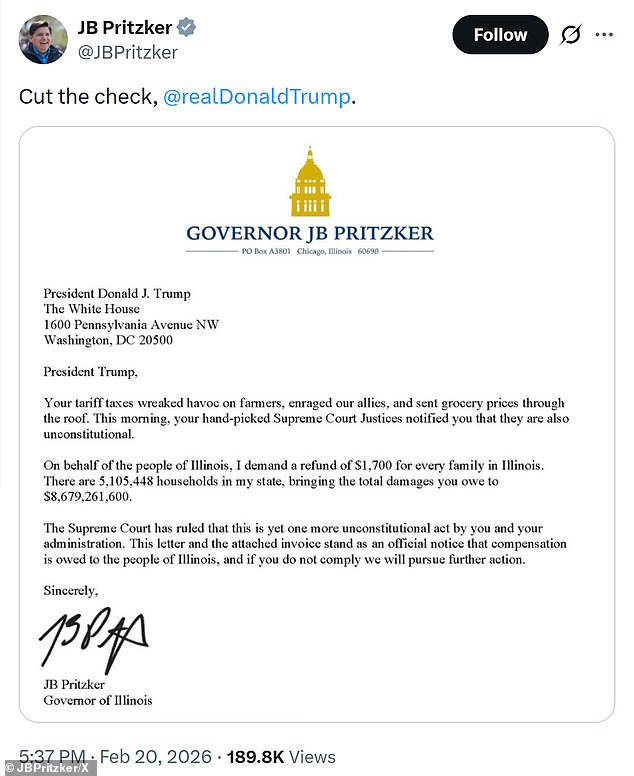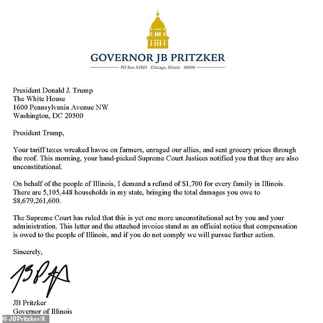 In the letter to Trump, Pritzker wrote: 'Your tariff taxes wreaked havoc on farmers, enraged our allies, and sent grocery prices through the roof. This morning, your hand-picked Supreme Court Justices notified you that they are also unconstitutional.'