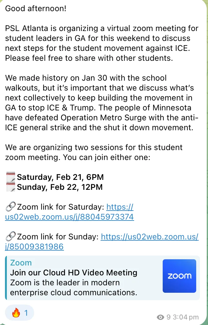 The PSL has followed a similar pattern, according to NAVI. Clapp used the webinars to praise the January 30 school walkout in Georgia and pressed students to escalate their demonstrations. Clapp encouraged students to form an "ICE Out Committee" at their schools and hold anti-ICE teach-ins, offering to provide materials for events and to connect students with bail fund groups to assist students who may get arrested.