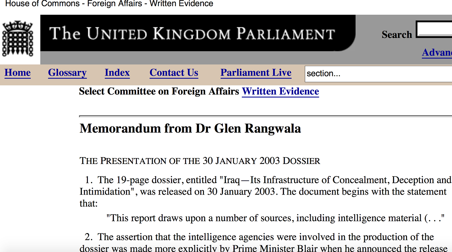Dr. Rangwala’s report which refuted the “intelligence report” was published by the House of Commons in June 2003, 3 months after the US and allied invasion