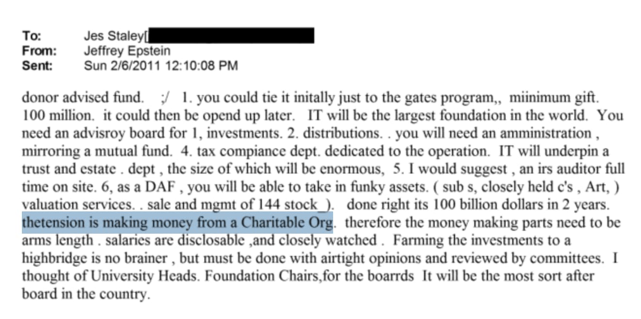 And he adds that the fund would have “access to the current Foundation’s pools of targets” while also “looking for both new opportunities with metrics for success.” In a single email, Epstein has sketched a vehicle with global reach, offshore flexibility, perpetual duration, and direct access to the Gates Foundation’s pipeline.
