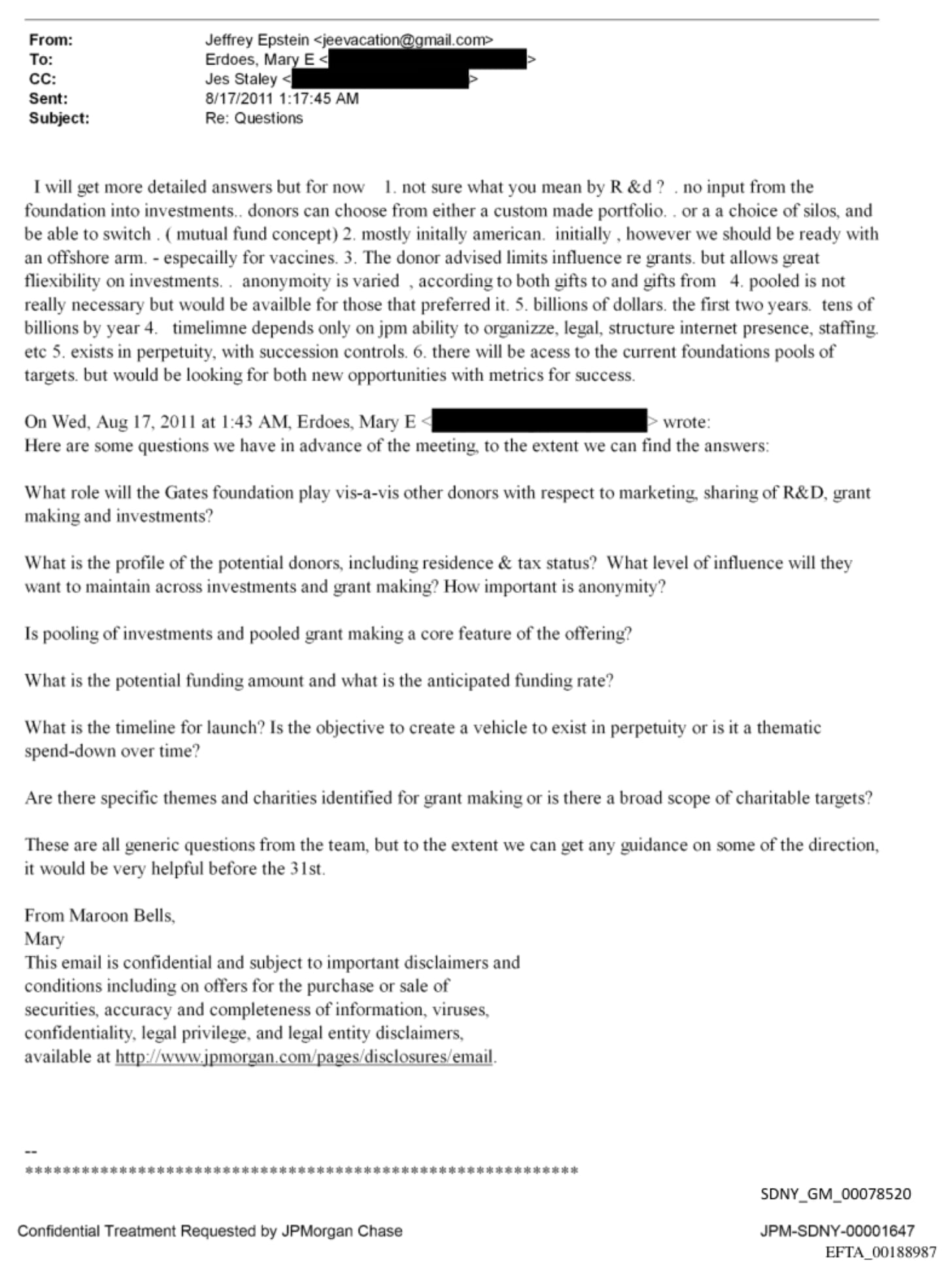Three weeks later, on August 17, 2011, Mary Erdoes—CEO of JPMorgan Asset and Wealth Management—emailed Epstein directly with a second set of structured questions in advance of an upcoming meeting. She was writing from Maroon Bells, Colorado—on vacation—and cc’d Jes Staley.