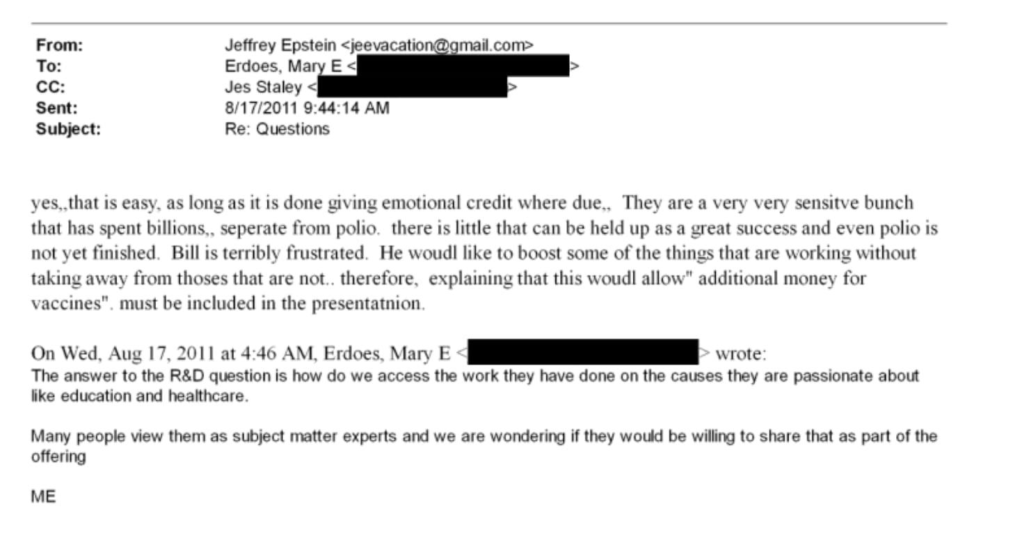 In the same correspondence, Epstein describes the Gates Foundation as “a very very sensitive bunch that has spent billions… there is little that can be held up as a great success and even polio is not yet finished.” This is not philanthropy analysis. It is client management. Epstein is coaching a Wall Street executive on how to handle a billionaire’s insecurities.