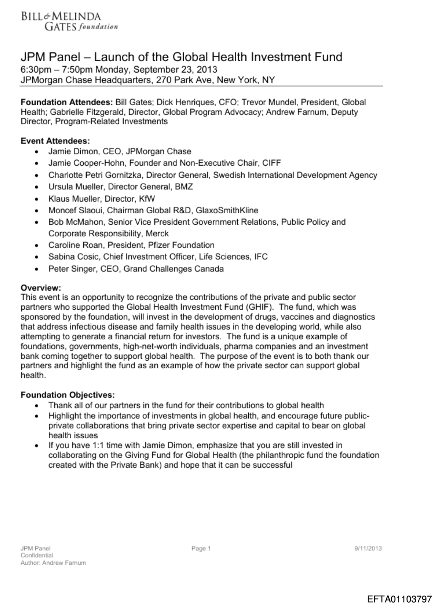 A confidential 15-page briefing prepared for a JPMorgan-hosted panel on September 23, 2013, describes the Global Health Investment Fund as “the first investment fund focused on global health drug and vaccine development.” The fund explicitly targets financial returns in the range of five to seven percent, while returning all investor capital.