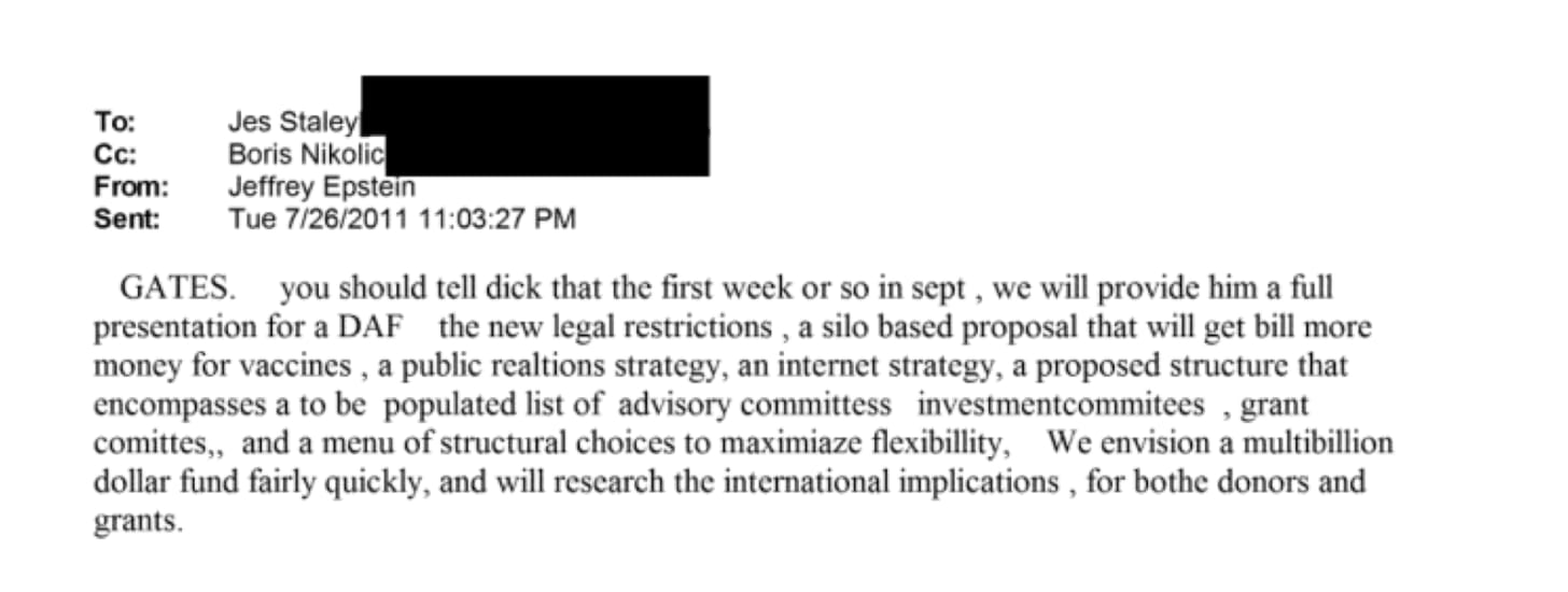 - Vaccines as capital strategy: Internal JPMorgan emails from 2011 show Jeffrey Epstein advising the bank’s most senior executives on how to pitch a Gates-anchored donor-advised fund, insisting the presentation include the phrase “additional money for vaccines” and directing the creation of an “offshore arm — especially for vaccines.”