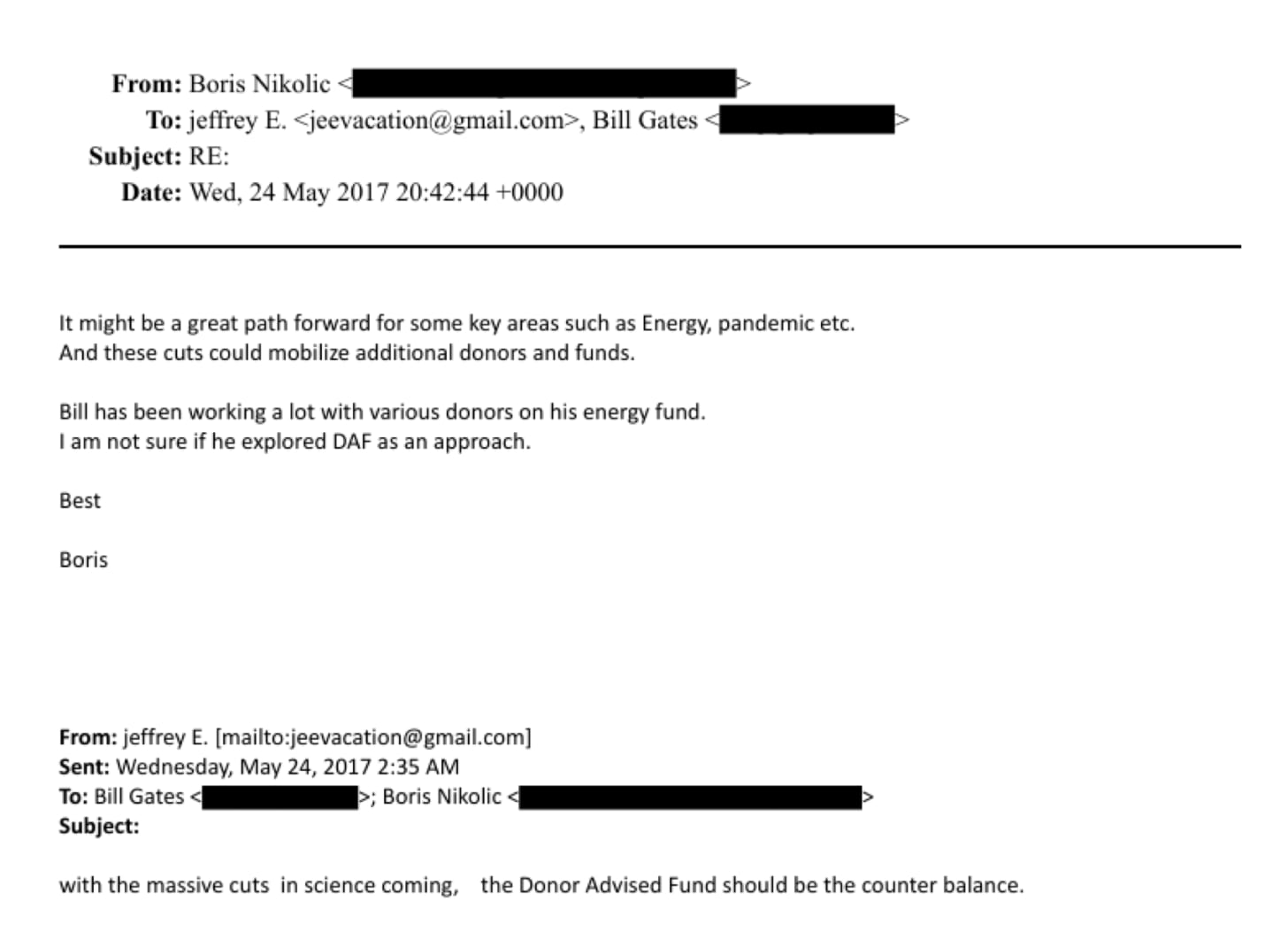 In May 2017, an email thread involving Epstein, Gates, and Boris Nikolic returns to the donor-advised fund concept. Epstein frames DAFs as a “counter balance” to anticipated cuts in public science funding. Nikolic responds with a line that deserves to be read slowly: