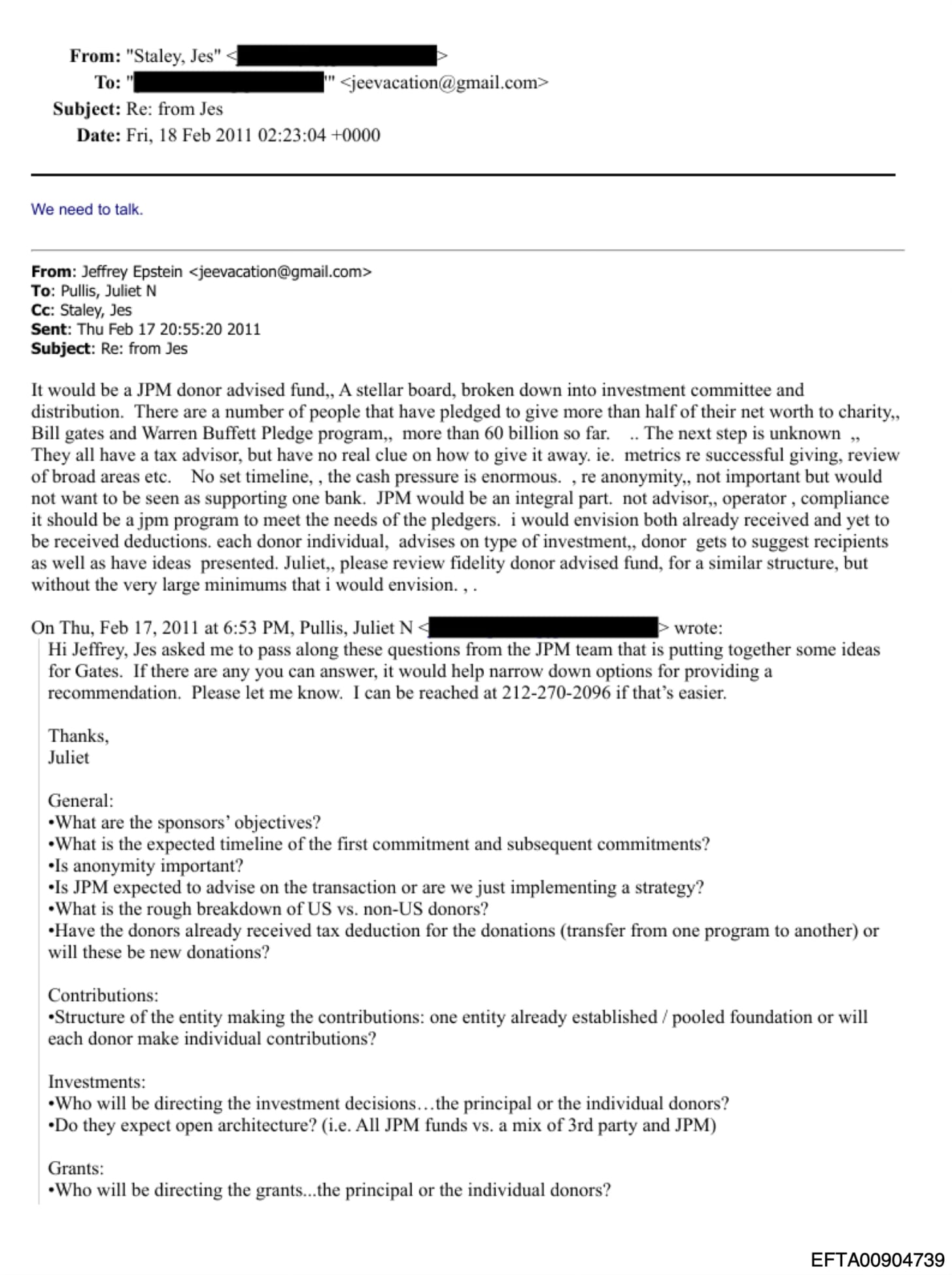 On February 17, 2011, Juliet Pullis, a JPMorgan executive working under Jes Staley, emailed Jeffrey Epstein with a structured list of questions. She explained that Staley had asked her to pass them along. The questions came from “the JPM team that is putting together some ideas for Gates.”