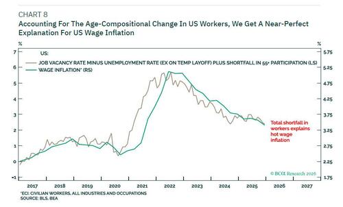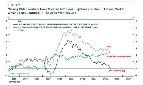 The reason that wage inflation has gapped structurally higher versus the jobs-workers gap is that the composition of the US labor market has structurally changed. As I highlighted in Why The World’s Fate Hangs On 2.5 Million Older American, there are almost 3 million fewer older workers in the US labor supply now than before the pandemic.