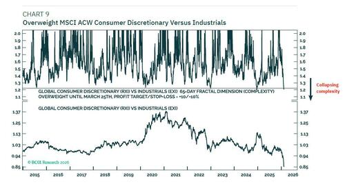 Consumer Discretionary has underperformed Industrials by almost 20 percent through the last 65 trading days. But the collapsed complexity of this near-vertical underperformance suggests that the magnitude and pace is overdone.