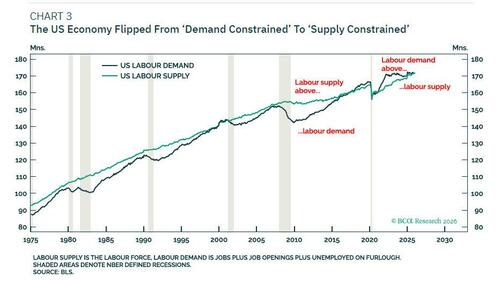 Now though, the US economy is at a watershed that puts it in ‘double jeopardy’. Given that labor demand and labor supply are in perfect balance, a drop in either would cause output to contract.