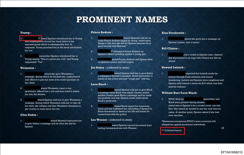 I want to be very careful here because these are allegations and President Trump has consistently – they're unverified allegations and President Trump has consistently denied all the allegations and any wrongdoing. BUT there was a presentation made by the FBI and the witness stated that Jeffrey Epstein introduced her to Trump, who subsequently forced her head down and punched her in the head in response to something that she did.