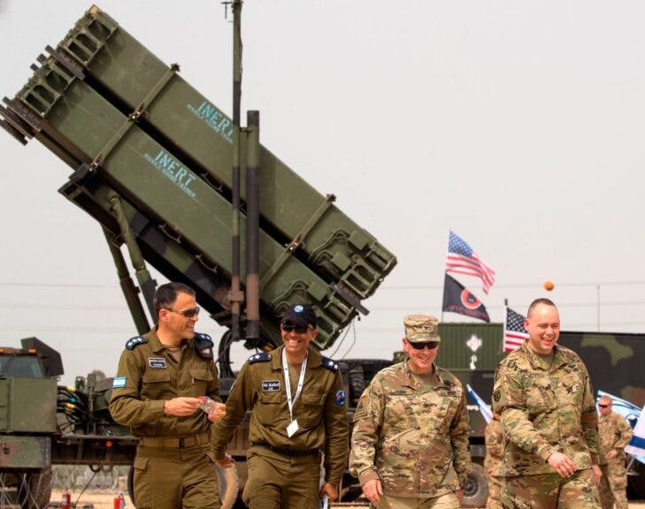 US and Israeli army officers walk in front a US Patriot missile defence system during the joint Israeli-US military exercise “Juniper Cobra” at the Israeli Hatzor Airforce Base on March 8, 2018.