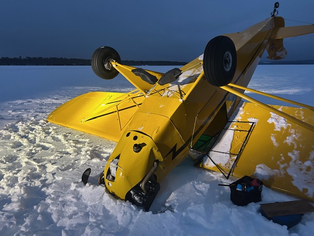 Upon arrival, responders traveled out onto the frozen lake and made contact with the pilot of a private plane that was lying upside down on the ice.
