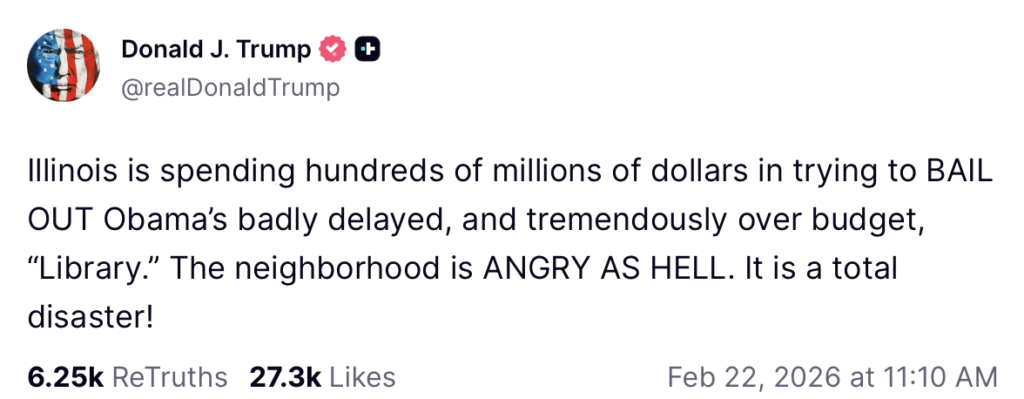 President Trump reacted to the report in a Truth Social post on Sunday, stating that Illinois taxpayers are now being forced to “bail out” the center. “The neighborhood is ANGRY AS HELL. It is a total disaster!” the president added.