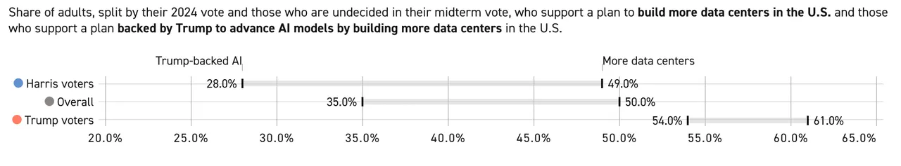 When Politico tied the data center buildout to President Trump’s administration, Democrats and undecideds soured on the idea, even though they were more enthusiastic without the mention of Trump: