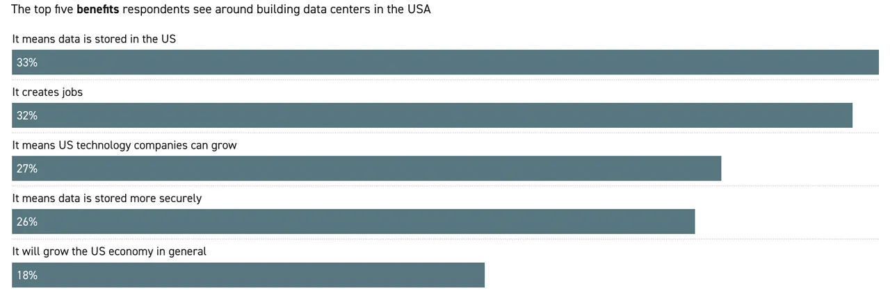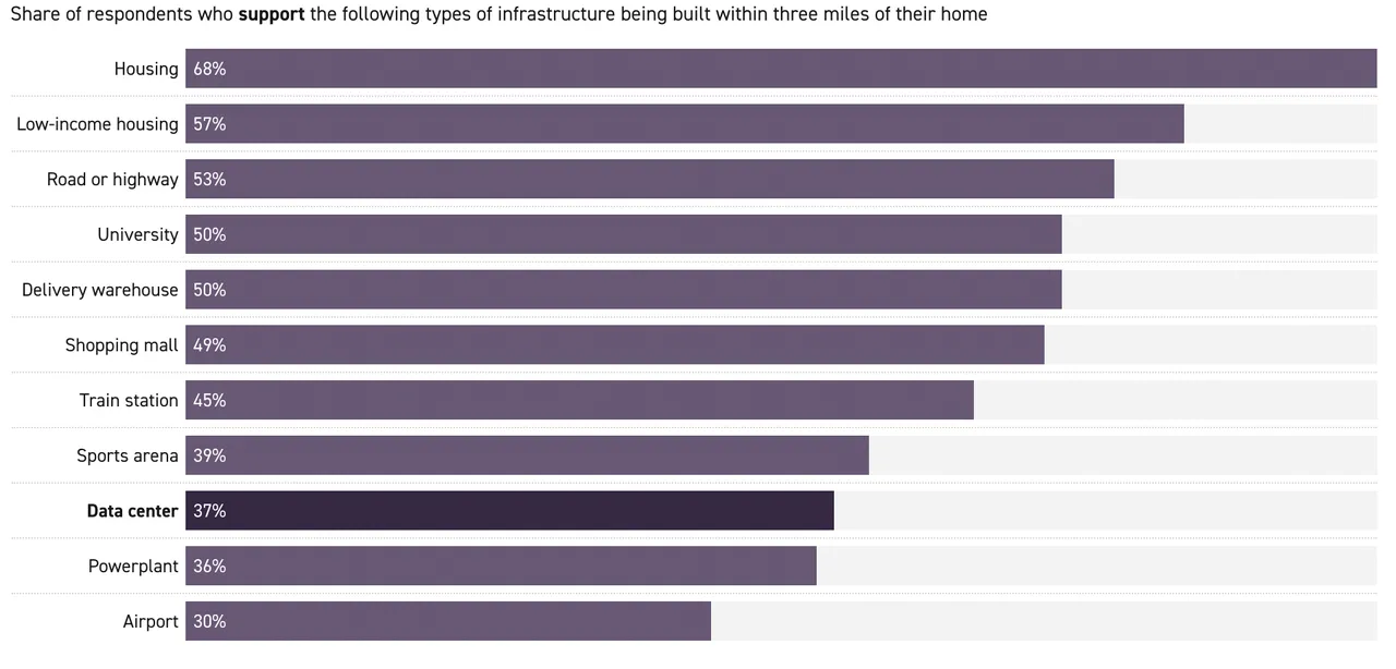 The poll also found that Americans would rather live next to a train station, a delivery warehouse, a road or a highway than a data center. Data centers rank just above a powerplant, and above airports.