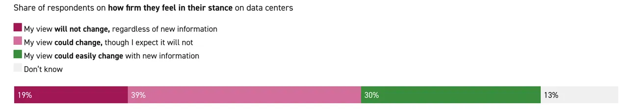 Americans are not exactly dead set on how they feel about data centers: 39% of respondents said they could change their view, though they don’t expect to do so, and 30% said they could easily flip depending on new information.