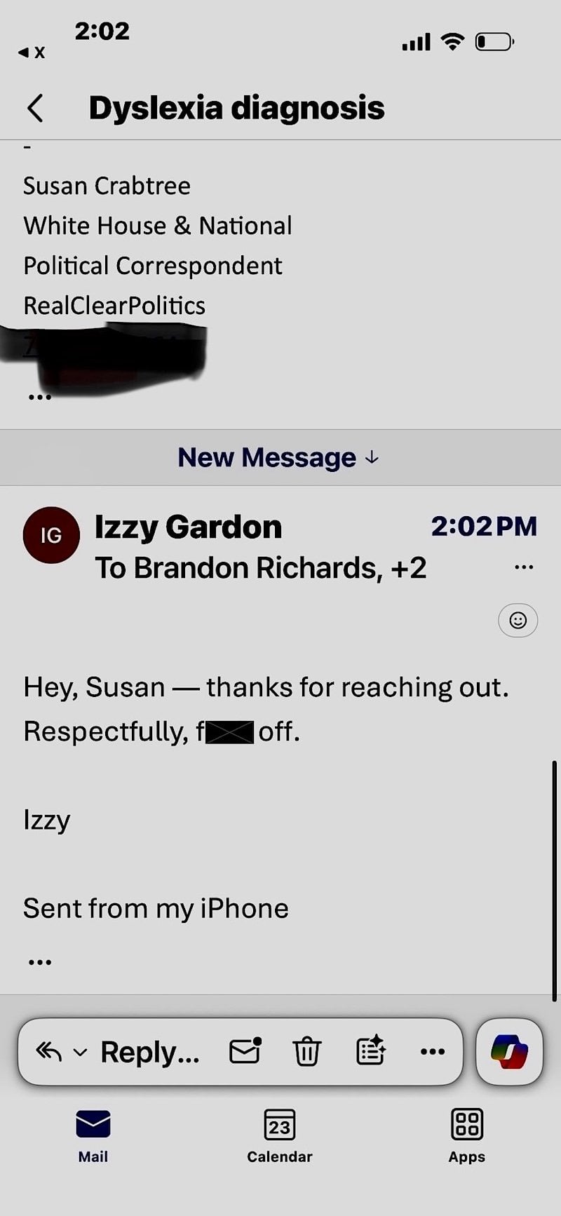 Izzy Gardon, Newsom’s government-paid director of communications, responded without any redaction: “Hey Susan, thanks for reaching out. Respectfully, f*** off.”