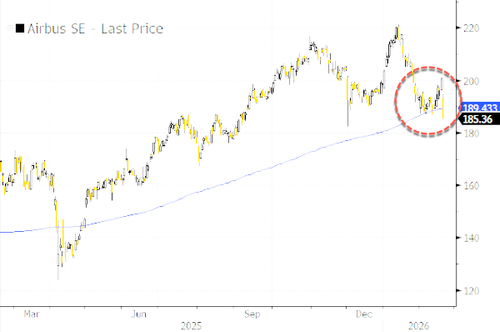 Shares of Airbus SE plunged as much as 8% in Paris trading after the aerospace and defense group guided to 870 commercial aircraft deliveries for 2026, well below the Bloomberg Consensus estimate of 896. Airbus blamed the softer outlook on the lack of reliable engine supplies for its A320 family of jets.