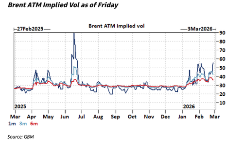 Despite a Middle East escalation remaining top of mind, positioning ironically feels cleaner (vs mid-Feb) with franchise flows skewed toward profit taking over the past week. This has kept a lid on call vols despite increasingly hawkish news flow + flat price moving higher in a high spot-vol correlation regime. Front month Brent implied volatility was at 60v on Friday, compared to a high of 90v in June last year. Meanwhile, 1 month 15 delta call skew was at 14 vols, compared to a 27 vol high last June. Net managed money (Brent + WTI combined) is sitting in the 59th percentile vs the previous 3 years. To play for a reprice in front vols and skew, we like owning front wingy outright calls.