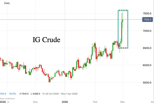 A synthetic weekend market via IG has crude oil prices up as much as 9% early Sunday morning.