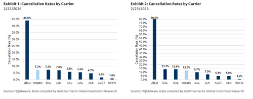 Cancellations were elevated on Sunday 2/22 and Monday 2/23, but largely driven by Winter Storm Hernando. On Sunday 2/22 and Monday 2/23, the industry saw an elevated level of cancellations, some of which were related to the ongoing unrest in Mexico, but with the majority driven by Winter Storm Hernando (see Exhibit 1 and Exhibit 2). For example, JetBlue had significantly higher cancellations than its peers on 2/22, with 44% of flights canceled vs. its competitors canceling less than 10% of flights, but JetBlue has <2% of capacity deployed to Mexico in 1Q 2026. Cancellations at select airports in Mexico were material, even from a global perspective, with Puerto Vallarta and Guadalajara among the top 20 airports with the highest cancellation rates across the world on Sunday 2/22 and Puerto Vallarata in the top 20 again on Monday 2/23 (see Exhibit 3 and Exhibit 4).