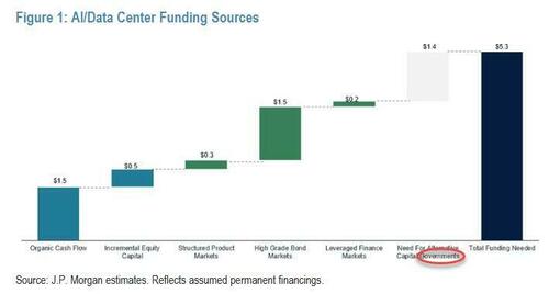 According to Insider, Blue Owl - which is also a leading investor in the data center boom funding countless projects with private loans - was unable to arrange financing for a $4 billion data center it is co-developing in Pennsylvania after pitching lenders to help bankroll the project in recent months.