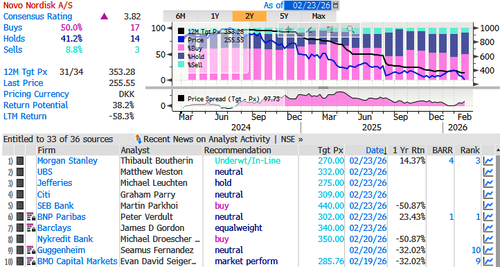 Bloomberg data shows 17 "Buy" ratings, 14 "Hold" ratings, and 3 "Sell" ratings on Novo. The average 12-month price target among Wall Street analysts is 353 kroner.