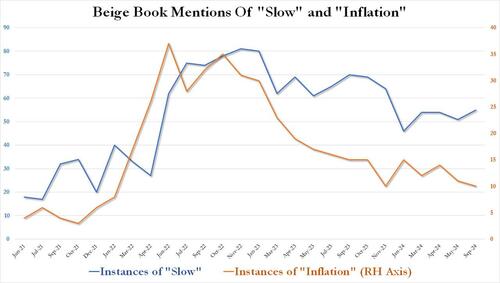 The chart below summarizes the Fed's mandate dilemma best: while mentions of "slow" have been consistently rising since troughing in January, Beige Book mentions of "inflation" are tied for the lowest in two years.