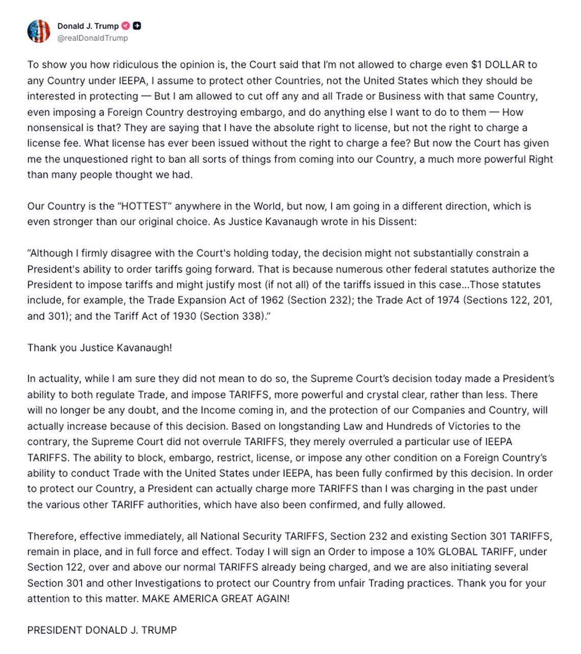 In actuality, while I am sure they did not mean to do so, the Supreme Court’s decision today made a President’s ability to both regulate Trade, and impose TARIFFS, more powerful and crystal clear, rather than less. There will no longer be any doubt, and the Income coming in, and the protection of our Companies and Country, will actually increase because of this decision. Based on longstanding Law and Hundreds of Victories to the contrary, the Supreme Court did not overrule TARIFFS, they merely overruled a particular use of IEEPA TARIFFS. The ability to block, embargo, restrict, license, or impose any other condition on a Foreign Country’s ability to conduct Trade with the United States under IEEPA, has been fully confirmed by this decision. In order to protect our Country, a President can actually charge more TARIFFS than I was charging in the past under the various other TARIFF authorities, which have also been confirmed, and fully allowed.