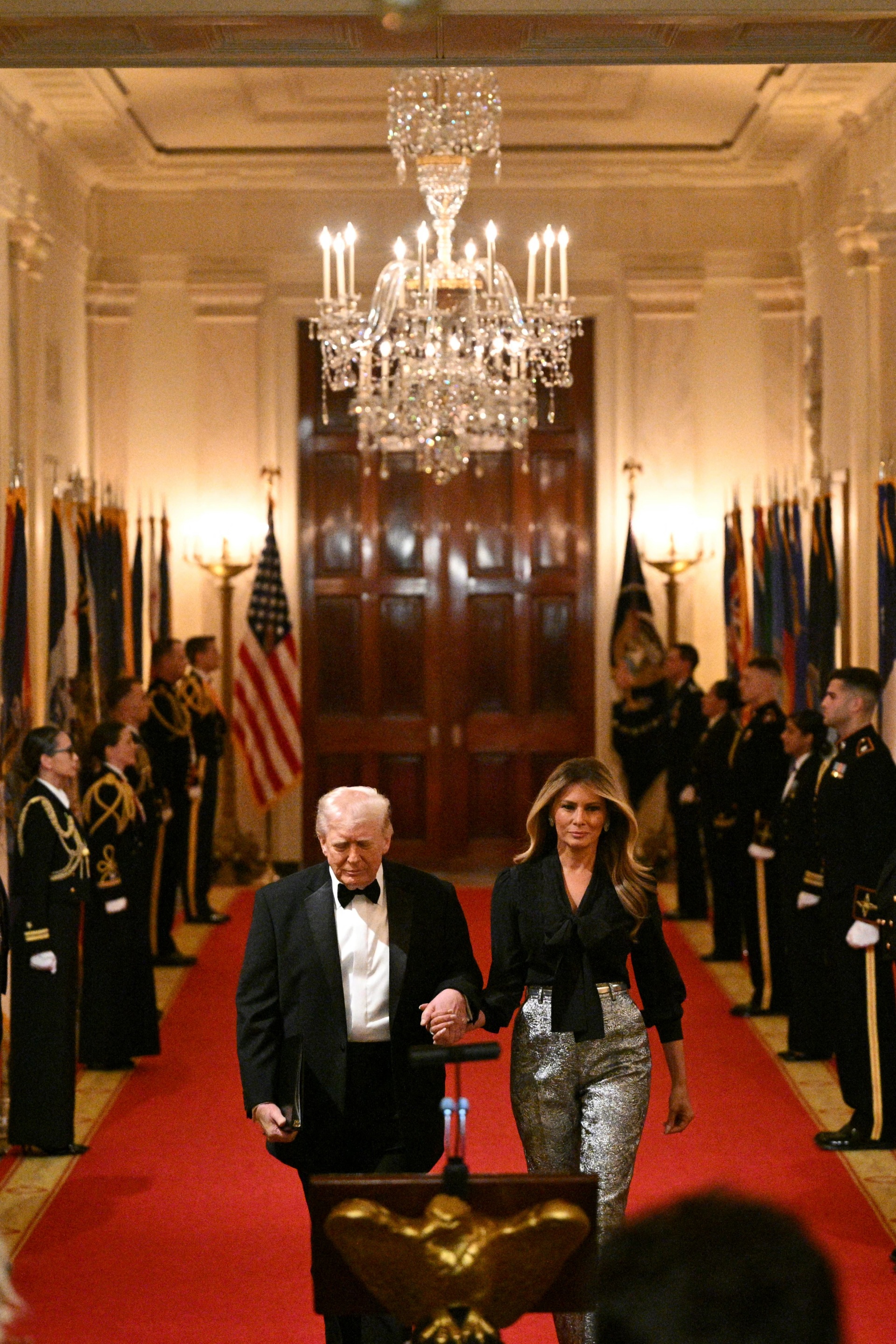 WASHINGTON, DC – FEBRUARY 21: U.S. President Donald Trump and first lady Melania Trump arrive during the National Governors Association Evening Dinner and Reception in the East Room of the White House on February 21, 2026 in Washington, DC. Trump is hosting the governors in Washington for the annual National Governors Association meetings. (Photo by Al Drago/Getty Images)