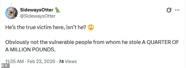 'He stole money from vulnerable people. This man isn’t a victim he’s a thief,' one person wrote.