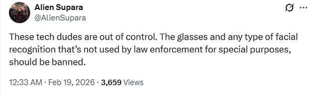 'These tech dudes are out of control,' another added. 'The glasses and any type of facial recognition that’s not used by law enforcement for special purposes, should be banned.'