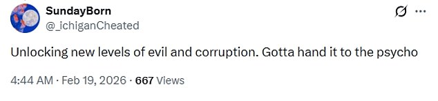 'Unlocking new levels of evil and corruption. Gotta hand it to the psycho,' wrote one user.