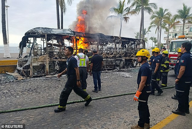 Fiery chaos has erupted throughout the Mexican state of Jalisco, leaving some tourists stranded. A bus set on fire by cartel members in the state is pictured