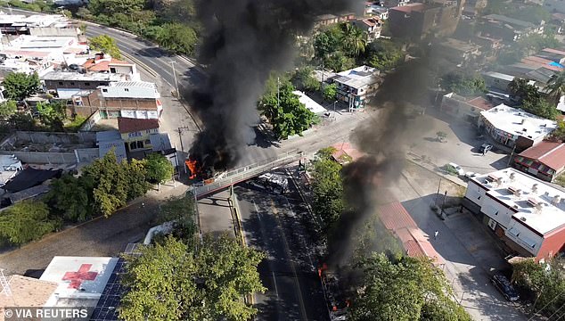 Columns of black smoke are pictured rising from Puerto Vallarta, a city popular with tourists. The chaos is thought to be in response to federal authorities killing a prominent cartel leader