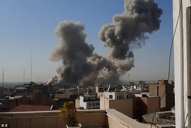 An image shows smoke billowing from a building after an explosion in Tehran, Iran, on Saturday morning
