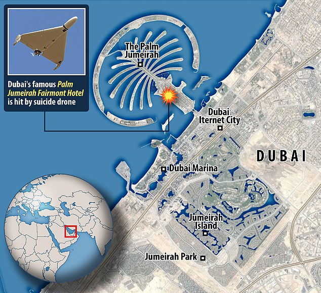 Dramatic footage and images captured the moment the five-star Palm Jumeirah Fairmont Hotel in Dubai was hit and set ablaze to the front of the building's exterior by an ultra-fast Shahed drone.
