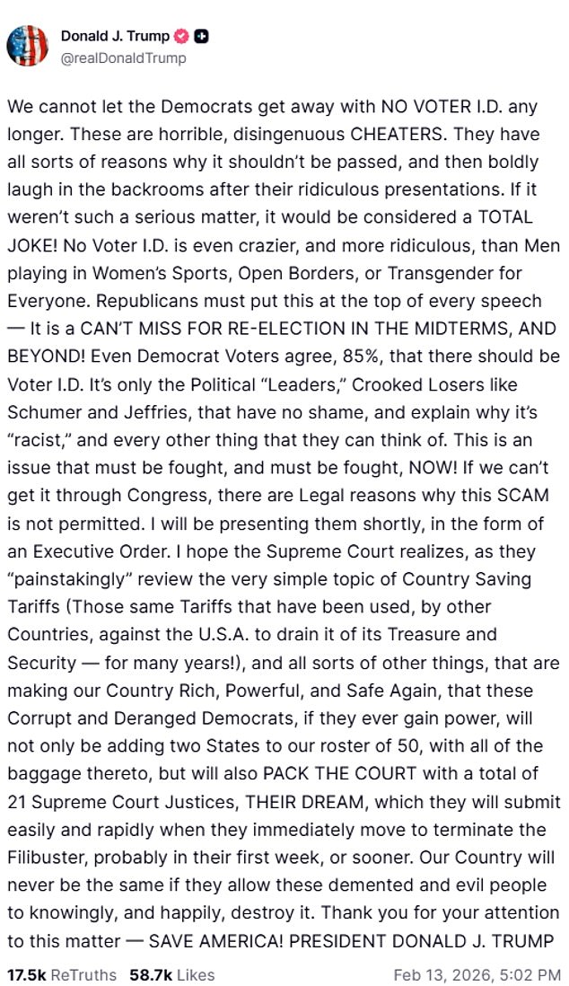 The President has long railed against 'rigged elections' since his defeat to Joe Biden in 2020 and has pushed the SAVE Act to force citizens to show ID to vote, against the wishes of Congressional Democrats
