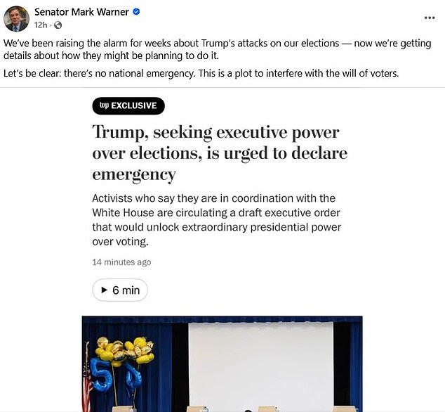 'We've been raising the alarm for weeks about Trump's attacks on our elections — now we're getting details about how they might be planning to do it,' Warner said.