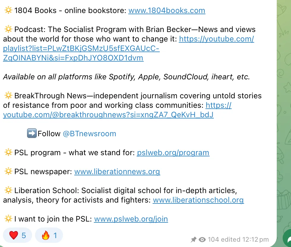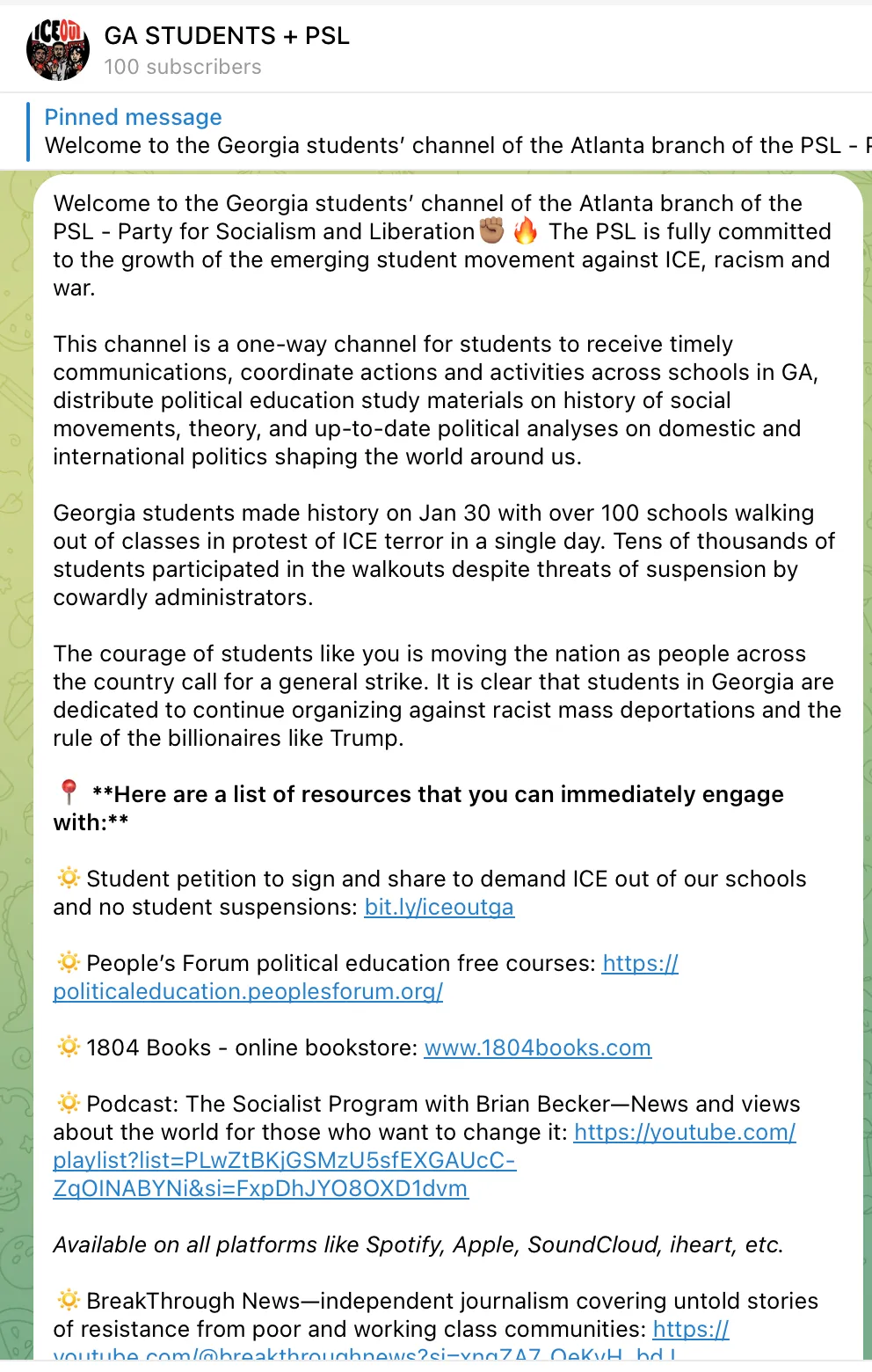 The Party for Socialism and Liberation (PSL), a Marxist-Leninist group that seeks to overthrow capitalism, has been a key player in the anti-Israel movement that gained steam in the United States after Hamas's Oct. 7, 2023, attack. The PSL has recently pivoted to teaching high-schoolers to walk out of their classes in protest against ICE, creating a Telegram channel for students in Georgia and holding online webinars to direct a "student movement against ICE."