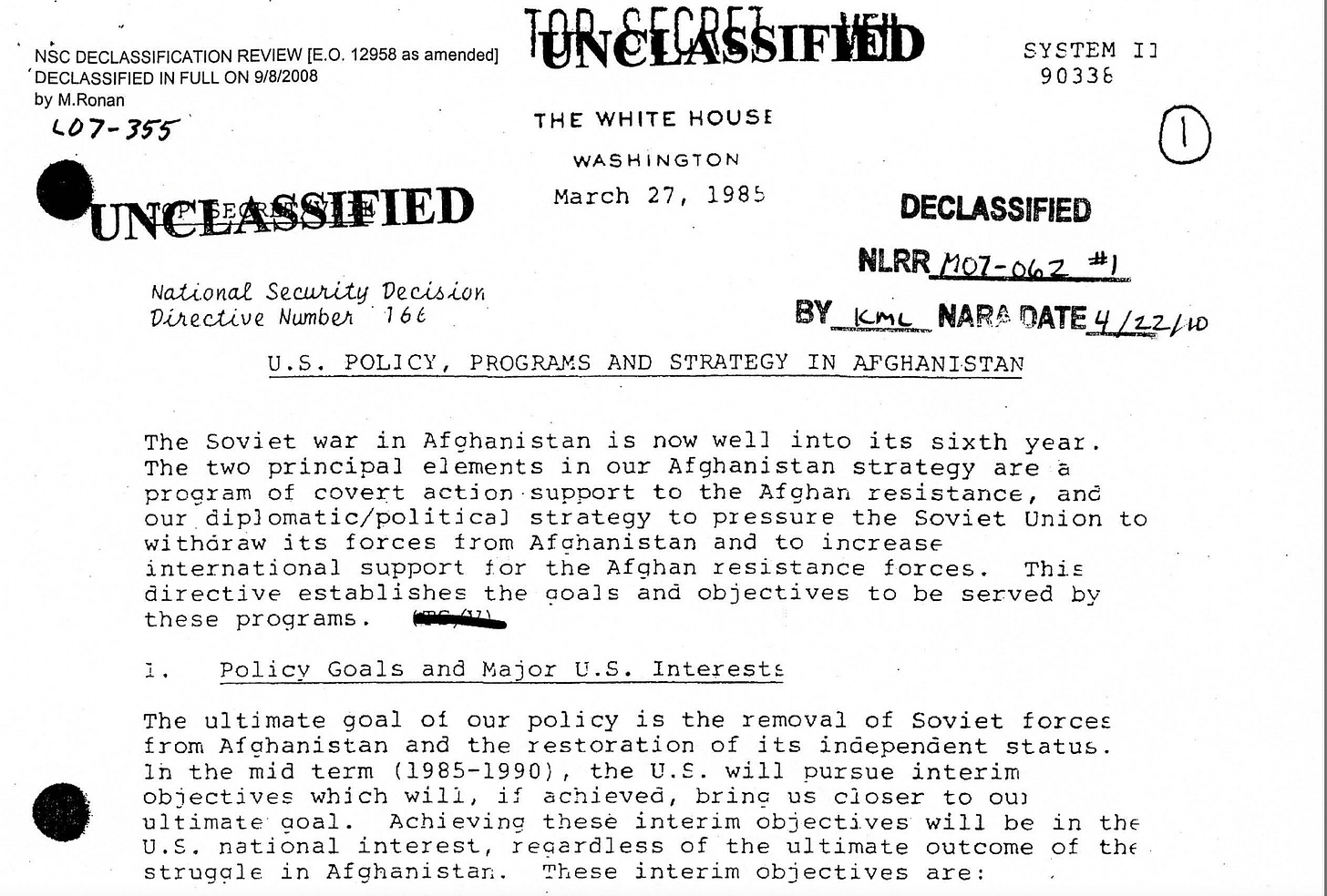 President Ronald Reagan issued (and signed) the National Security Decision Directive 166 (NSDD 166) (click link to read full NSS document), which de facto authorized “stepped-up covert military aid to the Mujahideen” as well as CIA support to religious indoctrination.