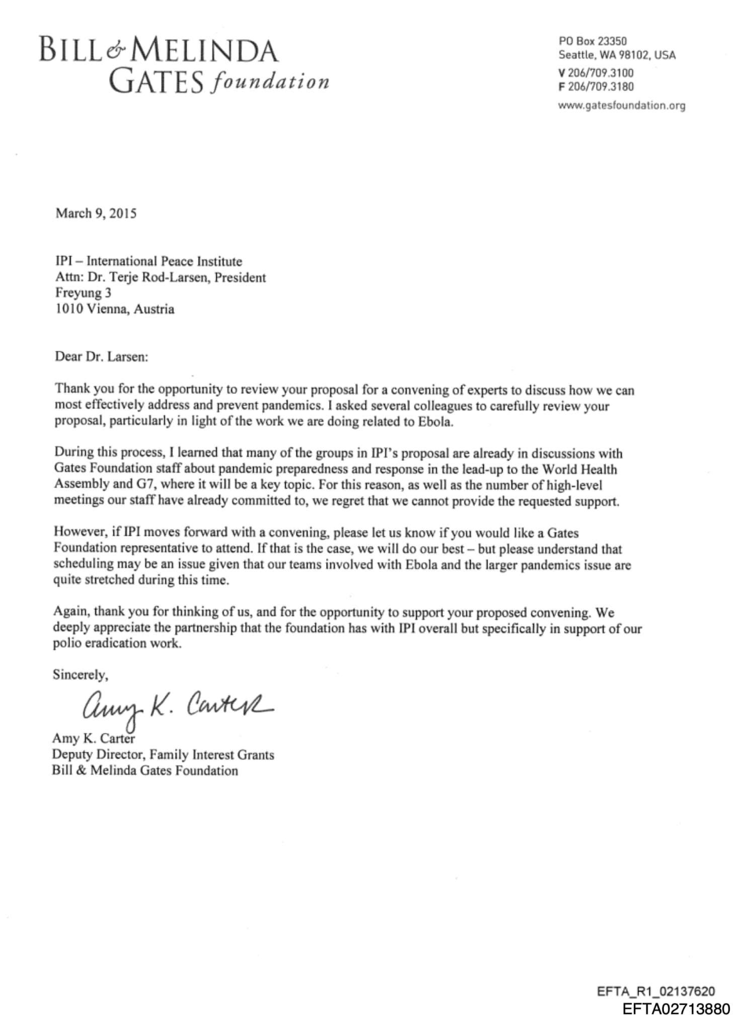 On March 9, 2015, Amy K. Carter, Deputy Director of Family Interest Grants at the Bill & Melinda Gates Foundation, wrote to Dr. Terje Rød-Larsen, President of the International Peace Institute, regarding IPI’s proposal for “a convening of experts to discuss how we can most effectively address and prevent pandemics.”