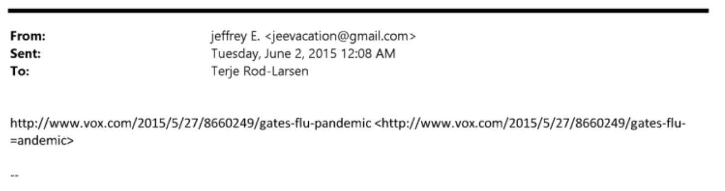 Three months later, on June 2, 2015, Epstein forwarded Rød-Larsen a Vox article about Bill Gates and flu pandemic preparedness—without comment, just the link. The URL: vox.com/2015/5/27/8660249/gates-flu-pandemic.
