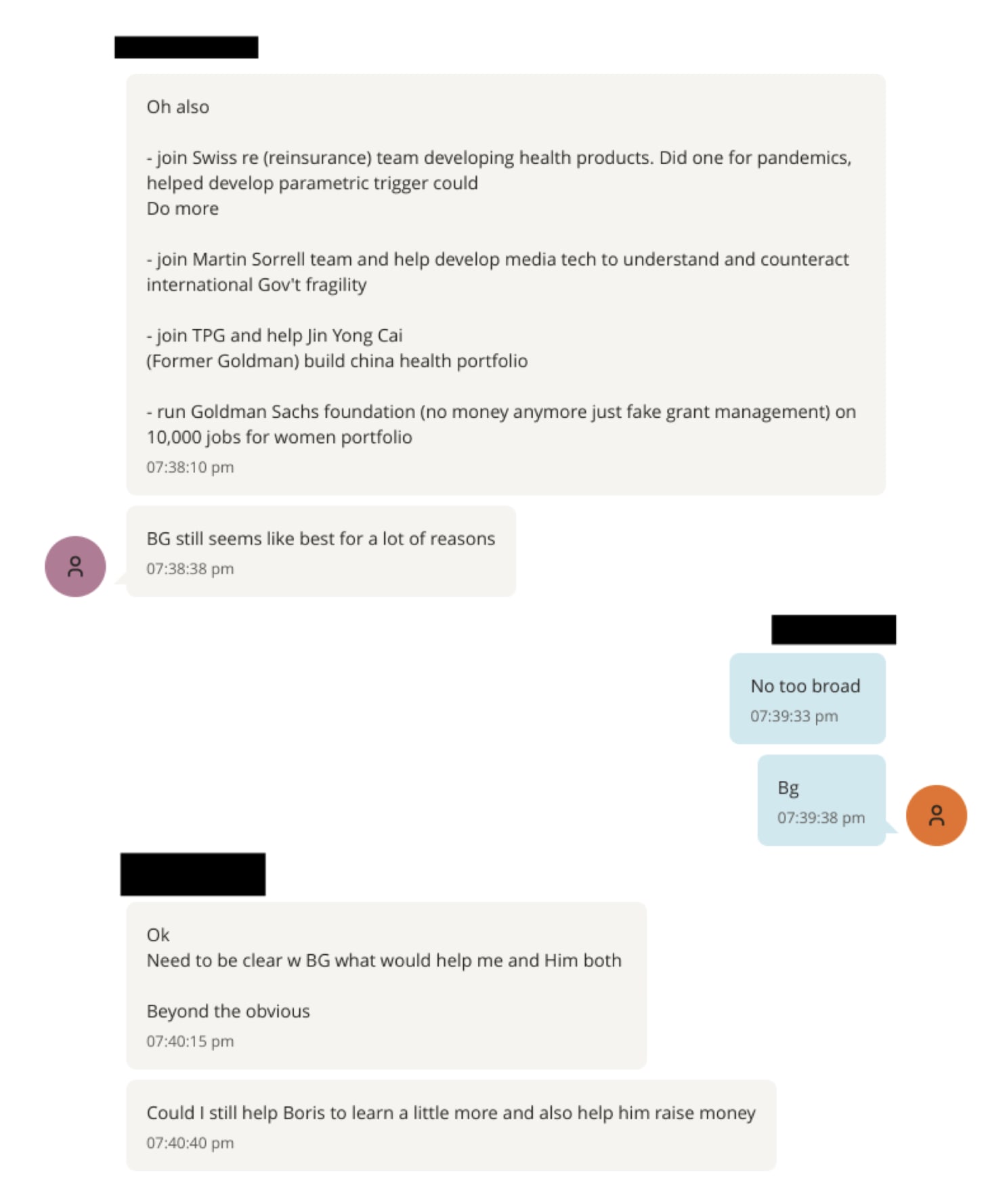Epstein’s response to this sprawling career inventory? “BG.” Then: “No too broad.” Then: “Bg.” He steers his associate toward Gates. The associate acquiesces. Epstein instructs: “Put together your resume… for my submission.”